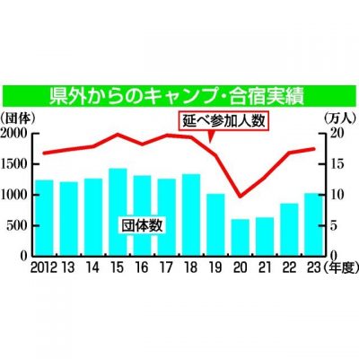 2024/06/07県内一般ニュース2023年度に県外から受け入れたスポーツキャンプ・合宿の延べ参加人数は前年度比3・72%増の17万4660人、受け入れ団体数は同19・21%増の1024団体で、ともに新型コロナ禍前の水準に回復したことが6日、県のまとめで分かった。コロナの...