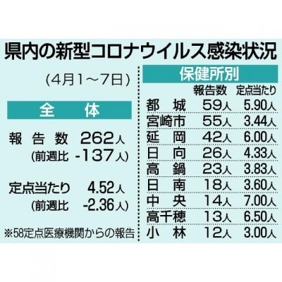 2024/04/12県内一般ニュース県は11日、県内の新型コロナウイルスの定点当たり報告数(1~7日)が前週比0・66倍の4・52人だったと発表した。 県薬務感染症対策課によると、58定点医療機関からの報告数(同)は262人。 保健所別の定点当たり報告数は、...