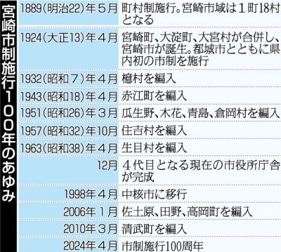 2024/03/31トピックnews宮崎市は1日、市制施行100年を迎える。1924(大正13)年4月に宮崎町、大淀町、大宮村の合併で誕生し、その後も周辺自治体を編入して市域は拡大。近代以降は本県の経済産業、文化振興の中枢を担ってきた。本格的な人口減少社会を迎える中、県都と...