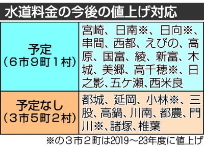 2024/03/30トピックnews水道料金改定について、県内自治体で日南、串間市など6市9町1村が今後の値上げを検討していることが、宮崎日日新聞が26市町村を対象に行った水道に関するアンケートで分かった。値上げを問う質問に、16市町村が「予定」と答え、日向市を除き時期など...