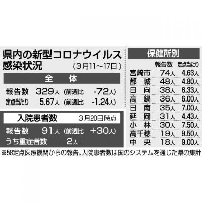 コロナ感染 前週比0・8倍 入院4週ぶり増加 宮崎県内