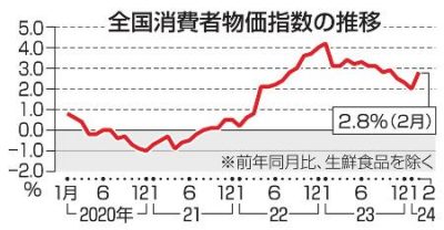 2024/03/22国内外ニュース 主要総務省が22日発表した2月の全国消費者物価指数(2020年=100、生鮮食品を除く)は、前年同月比2・8%上昇の106・5だった。伸び率は1月の2・0%から4カ月ぶりに拡大した。食品や宿泊料の値上がりが主な要因。さらに政府の電気・都市ガス...
