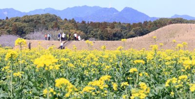 菜の花春風に揺れる 西都市・西都原古墳群、週末見頃