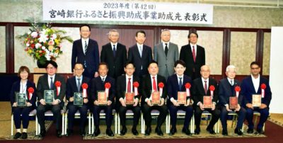 2024/03/06経済一般みやぎん経済研究所(杉田浩二理事長)は5日、2023年度「宮崎銀行ふるさと振興助成事業」の助成先表彰式を宮崎市の宮崎観光ホテルで開いた。10企業・団体に記念の盾と助成金を贈った。 地域産業の開発や振興に貢献した本県と鹿児島県の企業...