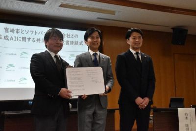 2024/01/31県内一般ニュース宮崎市と通信事業大手ソフトバンクは30日、グーグル製の生成人工知能(AI)を活用した業務効率化に向けた実証実験を行う覚書を締結した。会議録の自動作成や内容が複雑な市の内部規定を職員に回答するシステムの導入を目指す。 市は昨年4月、...
