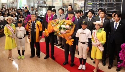 2024/01/28県内一般ニュースプロ野球・巨人の主力選手らは27日、春季キャンプに向けた自主トレーニングのため、本県入りした。新型コロナウイルスの影響で、4年ぶりの実施。宮崎市の宮崎ブーゲンビリア空港で歓迎セレモニーがあり、駆け付けた多くのファンが出迎えた。 セ...