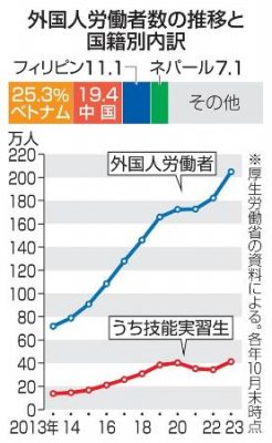 2024/01/26国内外ニュース 主要厚生労働省は26日、2023年10月末時点の外国人労働者が、過去最多の204万8675人だったと発表した。前年から22万5950人増え、初めて200万人を超えた。増加率は12・4%で、前年の5・5%を大きく上回った。国内の人手不足を背景に...