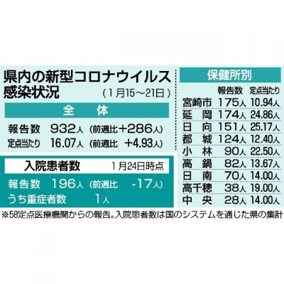 2024/01/26県内一般ニュース県は25日、県内の新型コロナウイルスの定点当たり報告数(15~21日)が前週比1・4倍の16・07人だったと発表した。9週連続で増加した。県感染症対策課は「発熱外来をはじめとする医療の逼迫(ひっぱく)を防ぐため、適切な感染防止対策の徹底を...