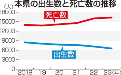2024/01/25社会news2023年の本県の出生数は6552人で、前年から8・4%(603人)減少し、初めて7千人を割り込んだことが25日、県のまとめで分かった。一方、昨年1年間に死亡した人は前年比259人増の1万6315人で、県の統計が残る中で最多となり、出生数...