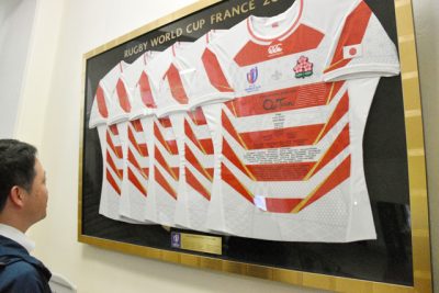 ラグビー日本代表のW杯記念ユニフォーム公開 県庁本館で3月末まで展示