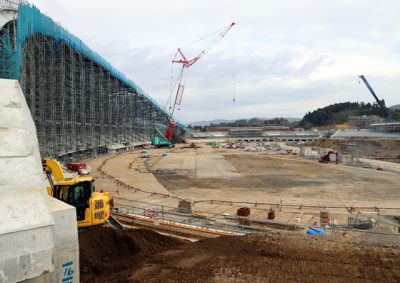 県新陸上競技場整備50% 大屋根骨組みお目見え、12月完成へ