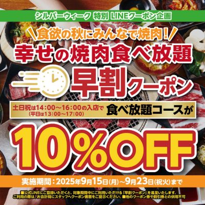 【かみむら牧場】シルバーウィーク特別企画!食欲の秋は“早割”でお得に焼肉食べ放題!敬老の日にあわせ、普段からご好評のシニア・ファミリー特典もご利用いただけます
