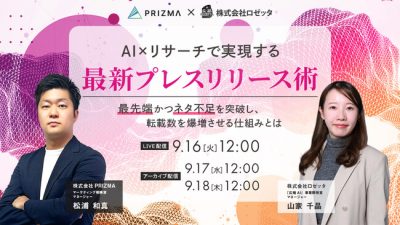 【9月16日(火)~3日間無料開催】AI×リサーチで実現する最新プレスリリース術 ~最先端かつネタ不足を突破し、転載数を爆増させる仕組みとは~