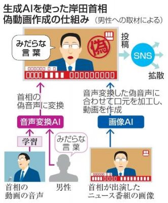 2023/11/10国内外ニュース 主要岸田文雄首相がニュース番組でみだらな発言をしたと見せかけた、人工知能(AI)による偽動画が交流サイト(SNS)で拡散し、波紋を呼んでいる。投稿した20代の男性は取材に応じ、動画や音声などを作る生成AIを使い、1時間ほどで偽動画を作ったと説...