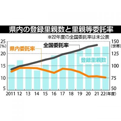 2023/11/05県内一般ニュース虐待や死別、経済的理由などで親と暮らせない子どものうち、里親(定員5、6人のファミリーホーム含む)への委託率が宮崎県内では減少傾向にあり、2022年度は10・2%だったことが、4日までに県のまとめで分かった。全国平均は2割を超え年々上昇す...