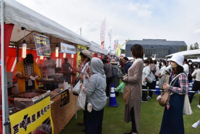 2023/11/04トピックnews県内の食が楽しめる「霧島秋まつり2023~宮崎のうまいもの大集合」(霧島酒造主催)は4日、都城市志比田町の「焼酎の里 霧島ファクトリーガーデン」で始まった。4年ぶり開催の今回は60店舗が並び、初日は1万2千人(主催者発表)でにぎわった。5...