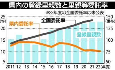 2023/11/04社会news虐待や死別、経済的理由などで親と暮らせない子どものうち、里親(定員5、6人のファミリーホーム含む)への委託率が県内では減少傾向にあり、2022年度は10・2%だったことが、4日までに県のまとめで分かった。全国平均は2割を超え年々上昇する中...