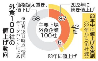 2023/10/25国内外ニュース 主要帝国データバンクは25日、外食産業の主要上場企業100社のうち4割強に当たる42社が、2023年に値上げを実施したか、実施を表明しているとの調査結果を発表した。前年の調査と比べると16社減った。帝国データは顧客離れへの懸念が高まっているこ...