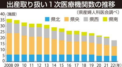 2023/10/20トピックnews低リスクの出産に対応する県内の医療機関が年々減っている。出産数の減少やハイリスク出産の増加などを背景に、県産婦人科医会(川越靖之会長)が調査した2008年から22年までの14年間で半減。多くは都市部に集中し、ゼロの地域も。妊産婦が遠方の病...