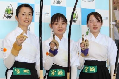 2023/10/16県内一般ニュース特別国体「燃ゆる感動かごしま国体」の弓道は15日、鹿児島県の出水市総合運動公園特設弓道会場で行われ、本県の成年女子遠的が優勝した。本県は1982(昭和57)年に頂点に立っており、現在の試合形式となってからは初。 メンバーは後藤蒼依...