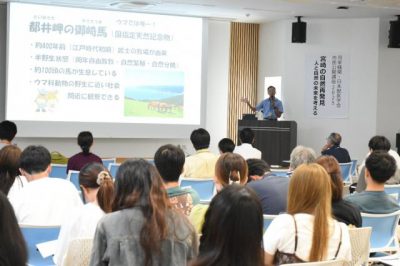 2025/09/07県内一般ニュース日本獣医学会学術集会の市民公開講座は6日、宮崎市の宮崎大錦本町ひなたキャンパスであった。市民ら120人が参加。大学教授ら3人が、串間市・都井岬の「御崎馬」や幸島のニホンザルなど野生動物と人との関わりについて解説した。 登壇者のうち...