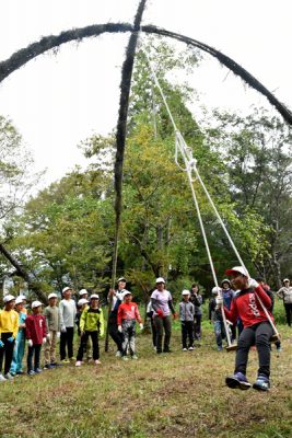 椎葉に竹製の巨大ブランコ 尾向小児童ら「森のゆうえんち」に設置