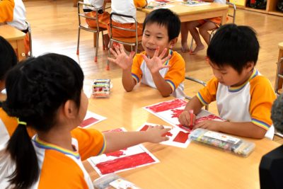 園児が国旗の塗り絵 県人会世界大会おもてなし、大会会場に展示