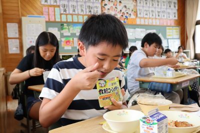2025/09/06トピックnews「防災の日」(1日)に合わせ、えびの市教委は2日、市内の全小中校で非常食を取り入れた防災給食を実施した。9校の約1100人が火を使わずそのまま食べられる非常食を味わい、災害時に備えた。 防災意識向上のため、昨年に続き企画した。非常...