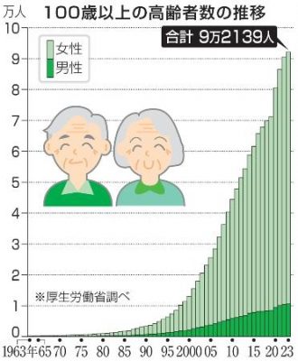 2023/09/15国内外ニュース 主要「敬老の日」(今年は18日)を前に、厚生労働省は15日、全国の100歳以上の高齢者が過去最多の9万2139人になったと発表した。昨年から1613人増え53年連続で増加。全体のうち女性が8万1589人と88・5%を占め、男性は1万550人。...
