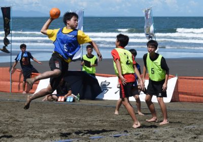 豪快にジャンプシュート 宮崎市青島でビーチハンドボール大会