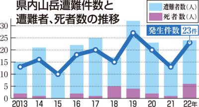 県内山岳遭難 昨年23件 体調管理徹底を 最多6人死亡 県警まとめ