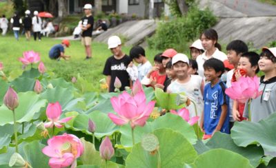 湿田彩るピンクや白の大輪 三股でハスの花 見頃迎える