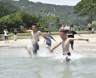 延岡3海水浴場で海開き 梅雨の晴れ間 子どもら初泳ぎ楽しむ