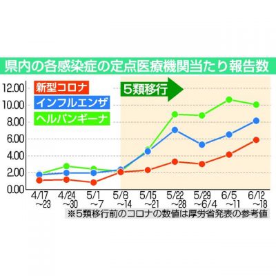 2023/06/27県内一般ニュース新型コロナウイルスの5類移行後、県内ではさまざまな感染症が流行している。インフルエンザは例年同期比で100倍以上の患者が報告され、感染状況は全国上位。新型コロナも増加傾向にある。人流が増える時季を見据え、専門家は感染拡大への警戒を呼びかけ...