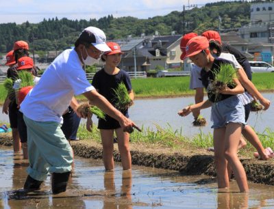 「池内米」はだしで田植え体験 池内小児童 生産者から米作り学ぶ