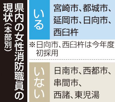 2023/06/21県内一般ニュース県内の10消防局・本部のうち、4月時点で女性消防職員が勤務しているのは5カ所にとどまることが20日、宮崎日日新聞のまとめで分かった。男性の仕事のイメージが強く、採用試験の受験者が少ない状態が続いていることなどが要因。県によると、2022年...