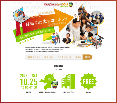 2025/09/02サンプルCoderDojo Japan子どものためのプログラミング道場「CoderDojo」に参加している人、興味・関心のある人のためのイベント「DojoCon Japan」が福岡県久留米市にて開催。2025年9月より参加申込も受付開始! Doj...