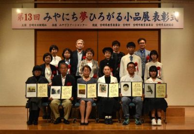 2023/06/13県内一般ニュース宮崎市のみやざきアートセンターで開催していた「第13回みやにち夢ひろがる小品展」(宮崎日日新聞社主催)は11日、表彰式と作品講評会を開き、閉幕した。会期中、1103人が鑑賞した。 表彰式は同市の宮日会館であり、入賞者40人に賞状と...