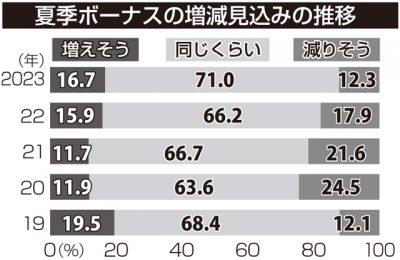2023/06/13経済一般みやぎん経済研究所が実施した夏季ボーナスに関するアンケートで、支給額が「減りそう」との回答が12・3%となり、昨夏比で5・6ポイント減少した。支給見込み額は「10万~30万円未満」が45・8%で最多。ボーナスの使い道や貯蓄の目的では「旅行...