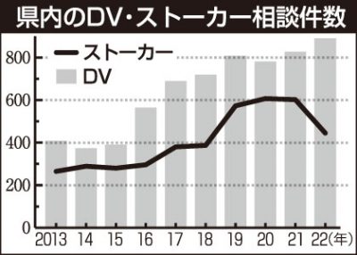 2023/05/04トピックnews県警に寄せられた2022年のドメスティックバイオレンス(DV)の相談件数が、2年連続で過去最多を更新し、890件に上ったことが分かった。ストーカーの件数は前年から大幅に減少したものの過去4番目の445件。県警人身安全対策課は「相談件数は氷...