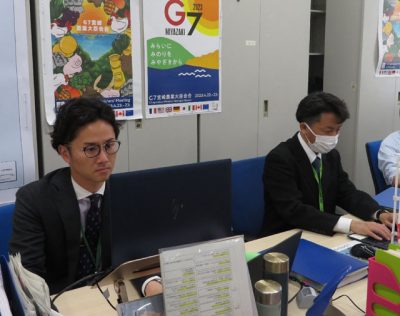 2023/04/15トピックnews宮崎市で22、23日に開かれる先進7カ国首脳会議(G7サミット)宮崎農相会合に向けて、農林水産省の準備室に連絡調整員(リエゾン)として派遣されている県職員の安竹竜一さん(52)と宮崎市職員の重吉龍太郎さん(32)が、最後の追い込みに奔走し...