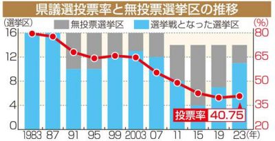 2023/04/10県内一般ニュース9日に投開票された県議選で11選挙区の投票率は40・75%となり、前回2019年の39・76%に次いで、過去2番目に低い結果となった。前回選挙戦となった5選挙区を比較すると、宮崎市区など4選挙区で前回投票率を上回ったものの、低投票率傾向に...