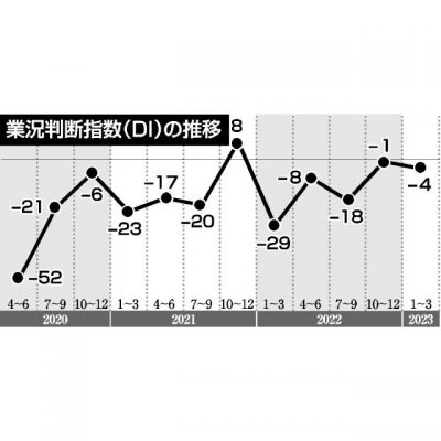 2023/04/05経済一般年末商戦の反動減影響 みやぎん経済研究所と県は4日、3月期(1~3月)の県内企業動向アンケート結果を発表し、企業の景況感を示す業況判断指数(DI)が、全体で前期(昨年10~12月)比3ポイント悪化のマイナス4だったことを明らかにした...