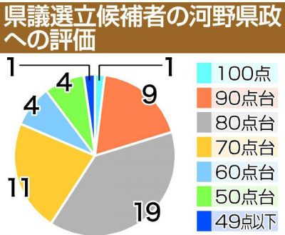 2023/04/01県内一般ニュース宮崎日日新聞は、31日に告示された県議選に立候補した55人に県政の課題などを問うアンケートを実施した。その中で激戦だった昨年12月の知事選を制して4期目に入った河野知事の県政運営に対する評価(100点満点)を問うたところ、平均は約76点(...