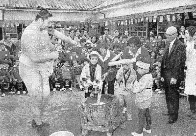 2023/03/31懐かしシリーズ地方巡業で来県した大鵬関が宮崎市大塚町の大塚あけぼの幼稚園を訪問。餅つきにも参加した大横綱に、園児は「テレビで見るより大きい」と興奮していた。...