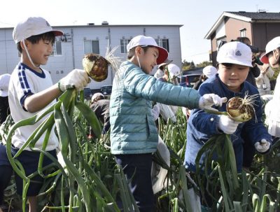 「空飛ぶ新玉ネギ」収穫の喜び体験 延岡南方小児童