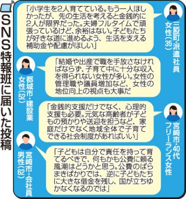 2023/02/08トピックnews岸田文雄首相が異次元の少子化対策を提起しましたが、県民の考える少子化対策を聞いてみたいです。 宮崎市・40代会社員男性 小学生の子ども2人を共働きで育てる宮崎市の男性は、大学進学に伴う教育費の負担が大きいと感じ「一番効果が...