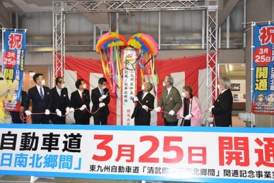 2023/02/06地域の話題東九州自動車道清武南―日南北郷インターチェンジ(IC、17・8キロ)の3月25日開通が発表されたことを受け、日南市などは6日、市文化センターで祝賀式を催した。商工関係者や市民ら約100人が参加。くす玉開きなどをして祝い、未事業化区間の早期...