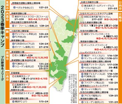 2023/01/26スポーツnow県は県内で行われる春季プロスポーツキャンプの日程を26日までに発表した。プロ野球は昨季日本一のオリックス・バファローズなど1軍5球団を含む計7球団が来県。2月後半には、ワールド・ベースボール・クラシック(WBC)日本代表「侍ジャパン」のキ...