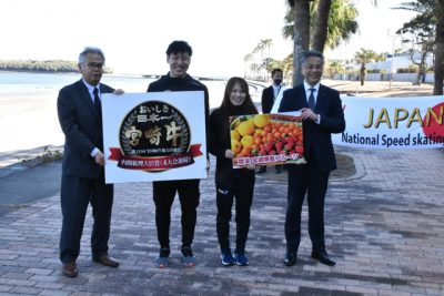 2023/01/12県内一般ニュース宮崎市で強化合宿を行っているスピードスケートナショナルチームを激励しようと、県や市は11日、宮崎牛10キロと日向夏などの県産品を贈った。昨年の北京五輪・スピードスケート女子団体追い抜きで銀メダルを獲得した佐藤綾乃選手(26)らが受け取り、...